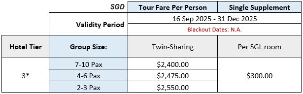 A. All tour fares are quoted in Singapore Dollars (SGD).