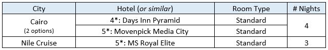 - Domestic airfare (Cairo > Aswan -- Luxor > Cairo) and any accompanying taxes & fees