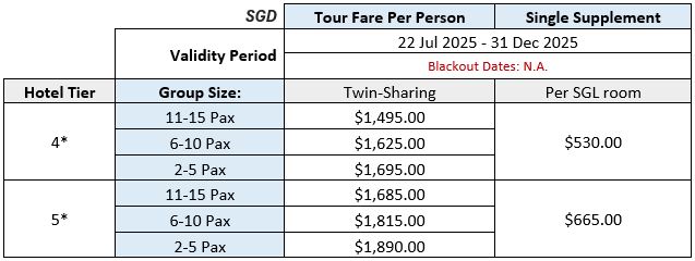 A. Of course! Even if your desired travel dates fall outside of the validity period shown in the Tour Fare table, simply indicate your choice of departure date in the Departure Date field of the enquiry form, and we will provide you with a quotation based on your customised travel period.