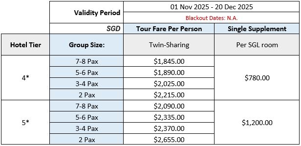 - All prices indicated are valid at point of quotation, and are subject to change based on final travel dates, availability at point of booking, and any other add-ons or customisation to the base package.