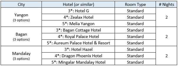 - Proposed accommodation options are subject to availability based on actual travel dates. In case of non-availability, an alternative accommodation at a similar or superior hotel will be secured.