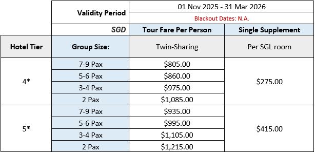 - All prices indicated are valid at point of quotation, and are subject to change based on final travel dates, availability at point of booking, and any other add-ons or customisation to the base package.